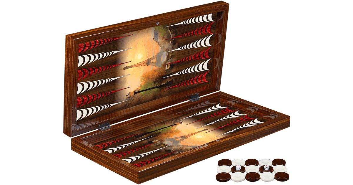 Artwork Backgammon Eiffel. Artwork & Premium Backgammon, main frames are made of 16mm and 4mm First Quality MDF Boards to maintain the durability of the rigid shape and form of our products. After profiling into various forms and measure, the MDF parts are proceeded to wrapping phase with PU glue with wood decorated High-Gloss PVC foils consistent with the product types. The inner & outer playing surfaces are applied with High Glossy (95%) Acrylic UV Cured Varnish, non- yellowing, solvent, smell & vapor free. Instead of metal clips, High-grade Neodymium Magnets are installed. Optional accessories come with plastic, acrylic, polyester chips, larger dices, doubling cubes and dice cups, depending on product models.